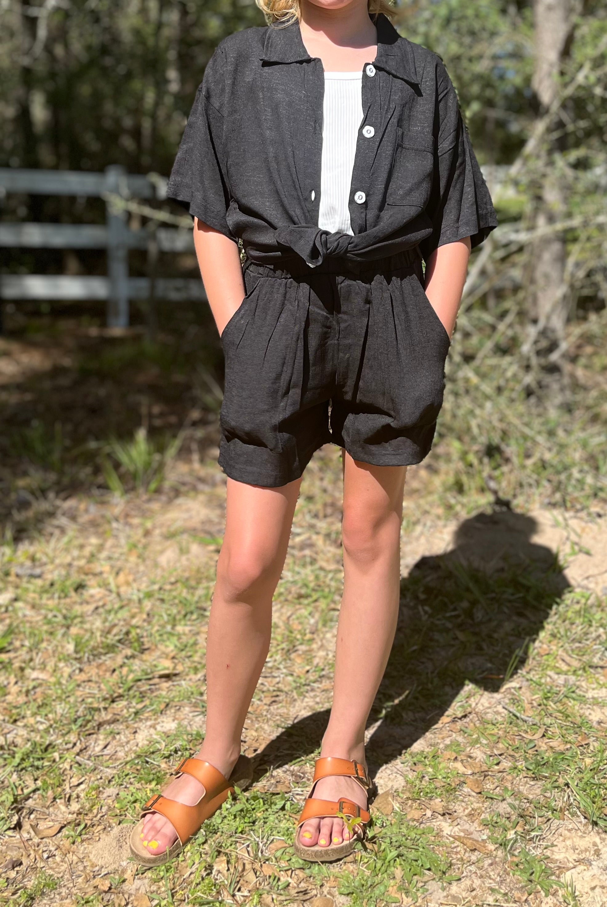 Looking for the perfect summer outfit? Look no further. This 3-piece girl's Short Set w/ Side Pockets and Button Down is THAT outfit. Dress it up or down.