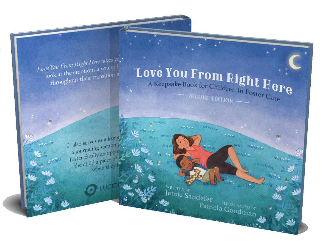 The Second Edition of Love You From Right Here is a children's book for children in foster care. Featuring a diverse representation of characters including men, women, boys, and girls, it is written from the perspective of the foster parent to the child in foster care. This book takes you through an abbreviated look at the emotions a young child experiences throughout their transition to a new foster home. The message to the child is that while they are in that home, they will be safe and loved. Love You From Right Here also serves as a keepsake book, with a journaling section containing writing prompts and places for photos and notes. Since children in foster care move an average of seven times in their lives, the keepsake section of this book gives foster families an opportunity to provide the child with a piece of their history if they leave.